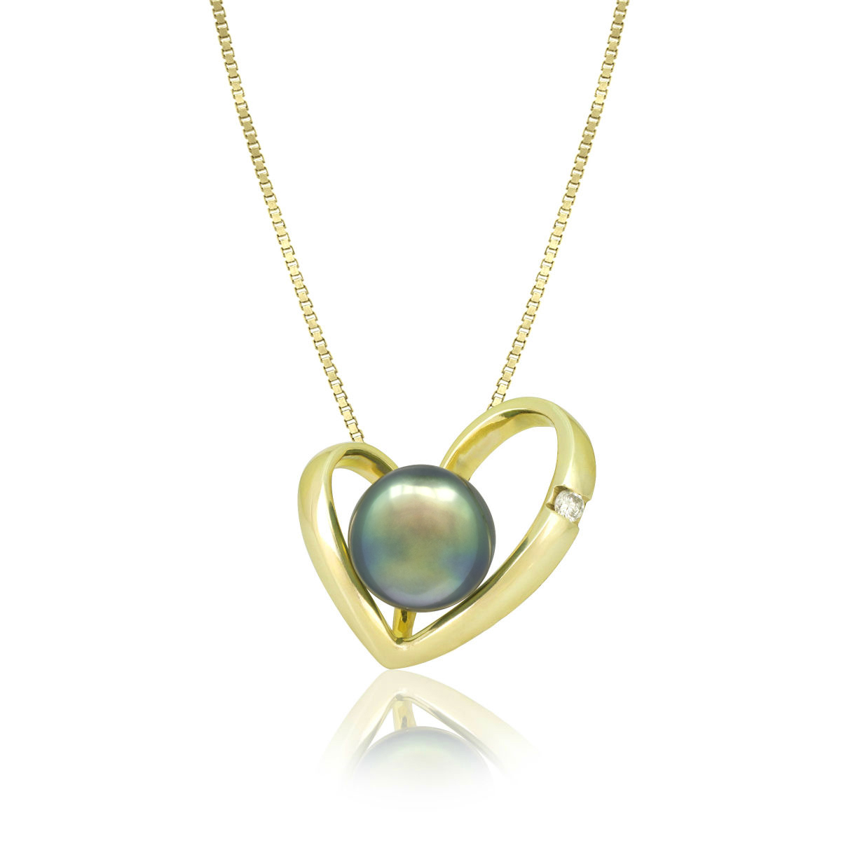 14K yellow gold Tahitian peacock pearl heart pendant. Great for everyday wear, or as a gift! Tahitian pearls are among the most valuable of cultured pearls recognized by their unique dark color qualities. However the exotic peacock colored variety consists of slightly richer green and blue hues with elegant pink to purple overtones, with no two pearls being exactly the same.